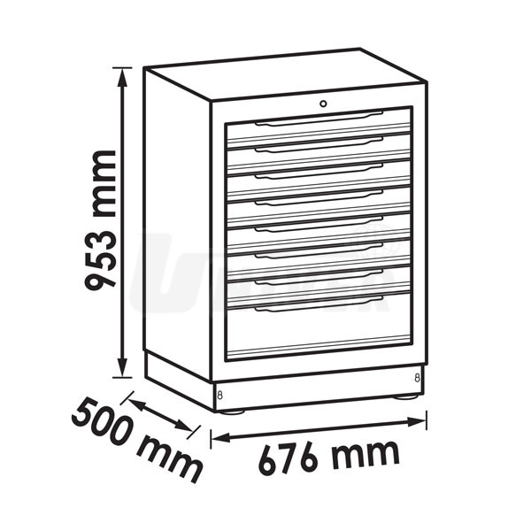 Celokovová dílenská skříň s 8 zásuvkami (7 horních nízkých, 1 standardní).- shodné se sérií L