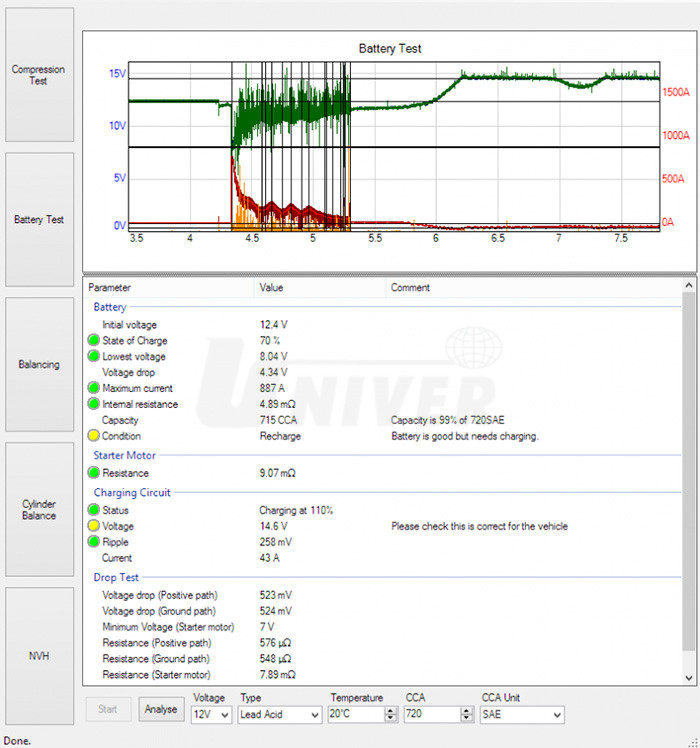- použít lze rovněž systém PicoDiagnostic, který provede kontrolu po jednoduchém připojení na baterii kontrolu stavu motoru – test komprese (relativní komprese na každém válci), vyvážení válců / výpadky zapalování (na každém válci), test baterie (CCA, měří se stav nabití a napětí během startování motoru), test startéru (měří se odpor cívky startéru a úbytek napětí na kabelech), test alternátoru (měří se nabíjecí napětí a proud, zjišťuje se nepřiměřené diodové zvlnění), výsledky jsou zobrazeny i jako sloupkové diagramy