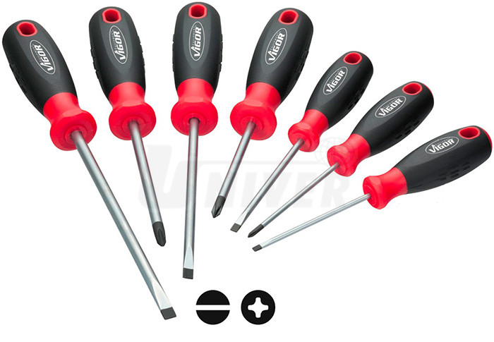 7-dílná sada šroubováků vysoké kvality z chrom-vanadia. Šroubováky mají speciální dvoukomponentní ergonomické rukojeti, což umožňuje vysoký přenos síly. Sada obsahuje tyto šroubováky:4 x ploché šroubováky (-) 3,0x75 mm / 4,0x80 mm / 5,5x125 mm / 6,5x150 mm