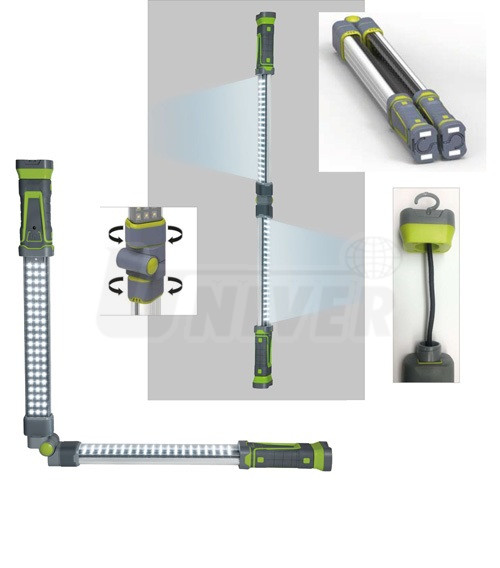Velmi praktická montážní lampa má 120 LED SMD, nabíjecí Li-ion baterii 3,7 V 4000 mAh, nabíječku, skládací, natáčecí konstrukci, na každém konci hák pro zavěšení a dva silné magnety a stojan.- praktická, víceúčelová montážní lampa