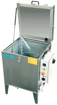 Automatický mycí /čisticí stroj TWA 70 německého výrobce Rapid Maschinenfabrik GmbH je určený pro vysoce kvalitní mytí/čištění horkou vodou s biologicky odbouratelným čisticím prostředkem předmětů, jako jsou např. součástky v autoopravnách, díly strojů v průmyslové údržbě apod. Toto moderní zařízení odstraňuje oleje a mastné nečistoty perfektně za krátkou dobu. Vzhledem k integrovanému časovému spínači, nastavitelnému termostatu a seřízeným tryskám lze mycí proces nastavit zcela optimálně.Mytí/čištění předmětů je velmi jednoduché. Mycí zásobník se naplní směsí vody a čisticího prostředku. Znečištěné součásti se vloží na rotující mycí koš a uzavře se víko stroje. Poté se naprogramuje požadovaná doba a teplota mytí/čištění. Ve stroji rotuje ponorný koš a čerpadlo ostřikuje znečištěné předměty vysokým tlakem čisticí kapaliny přes důmyslně uspořádaný systém trysek. Rotace koše, mechanické a chemické působení mycího prostředku v kombinaci s teplotou a příslušnou dobou mytí - to je ideální kombinace pro zajištění dokonalého mytí/čištění.