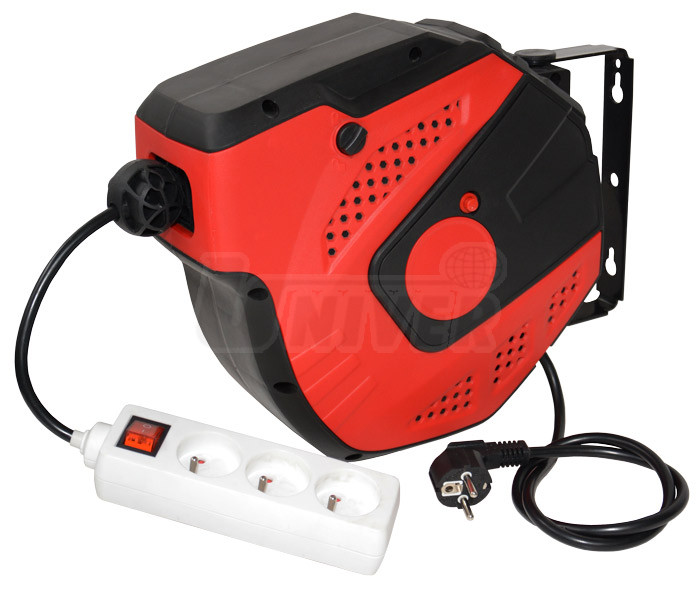 Automatický kabelový naviják pro upevnění na stěnu nebo strop je vybavený el. kabelem dl. 14 m, trojzásuvkou 230 V s vypínačem.- skříň ze speciálního plastu na bázi PP odolného proti nárazům i povětrnosti