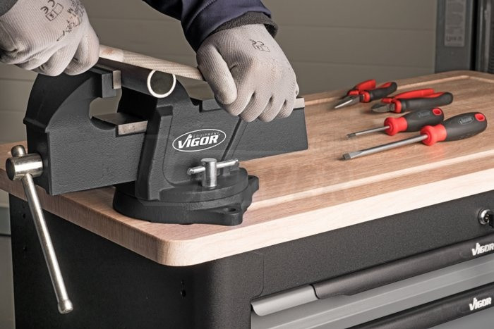 Otočný dílenský svěrák s šířkou čelistí 150 mm.- snadno se instaluje šrouby na pracovní stůl