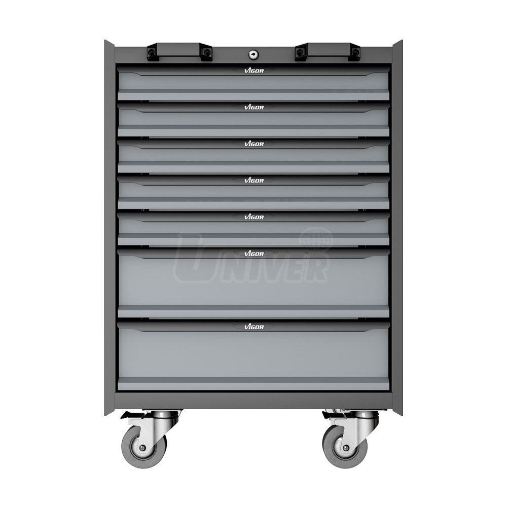Dílenský vozík se 7 zásuvkami (5 horních nízkých, 2 standardní) pro skříňové stěny VIGOR.- umístění dílenské vozíku pod pracovní deskou skříňové stěny VIGOR šetří místo
