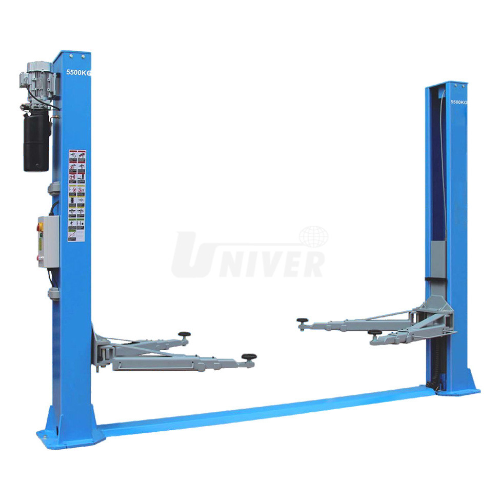 Elektrohydraulický dvousloupový symetrický zvedák s vysokou nosností 5500 kg a přímými výsuvnými rameny.