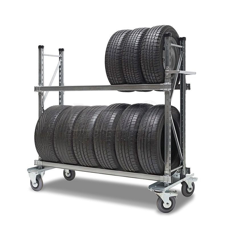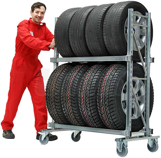 Dvouúrovňový pojízdný regál pro přepravu/skladování 8 (12) pneumatik/kol. Má podvozek se 4 kolečky (z toho 2 brzděná).Ocelová konstrukce je kompletně pozinkovaná.
