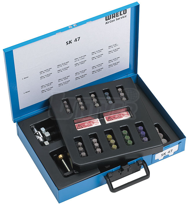 60-dílná sada obsahuje filtry různých velikostí, které zachycují nečistoty v klimatizačním systému.- sada 60 filtrů ve 20 velikostech a speciální nářadí