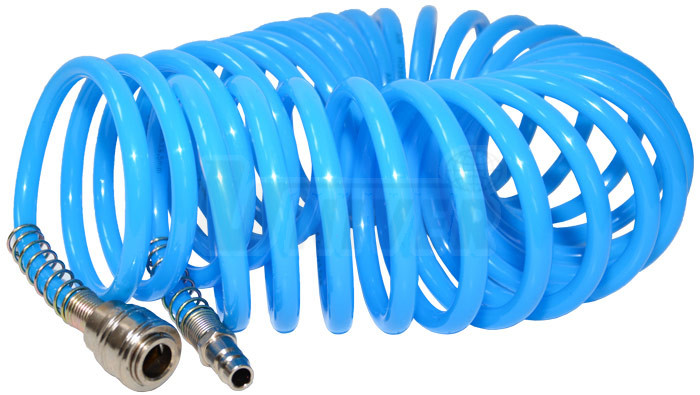 Spirálové hadice polyuretanové s rychlospojkou a vsuvkou na stlačený vzduch s vnitřním průměrem 6,5 mm.