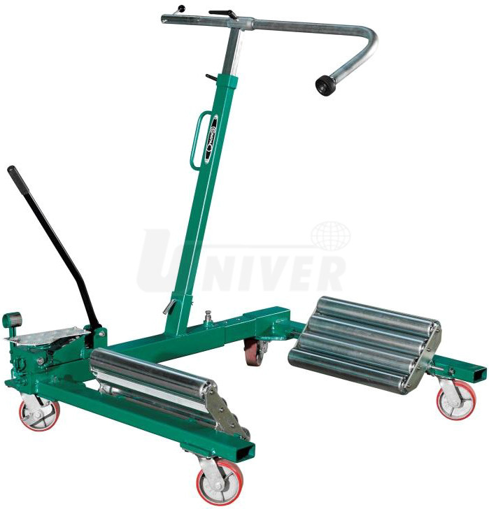 Hydraulický transportní a montážní zvedák pro kola zemědělských a stavebních strojů.- hydraulický zvedák o nosnosti 1,6 t pro převážení, montáž a demontáž velkých kol zemědělských a stavebních strojů o průměru kol od 1250 mm až do 2400 mm a šířky až do 1050 mm