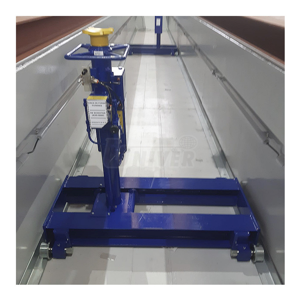 - 4 nerotující kolečka namontovaná na zesílených pružinách, šířka vozíku se zhotoví podle rozměrů jámy, 4 vodicí kolečka, při hmotnosti 1 000 kg jsou pružiny stlačeny a vozík je zafixovaný na podlahu