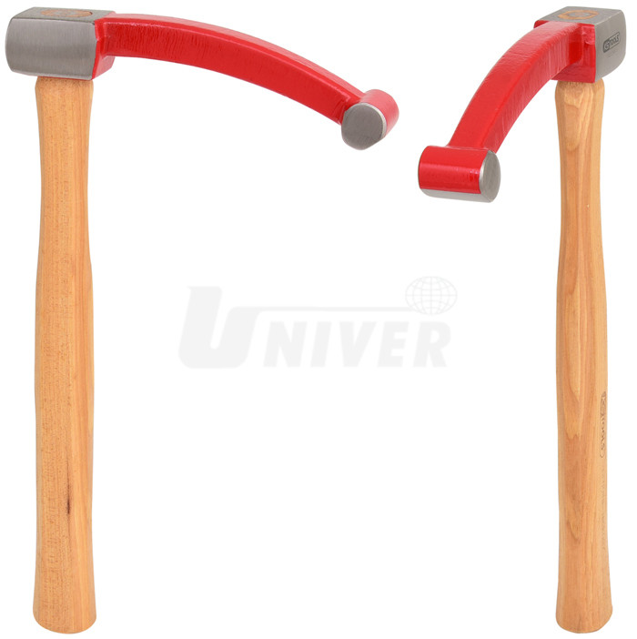 Karosářské vyklepávací kladivo na blatníky délky 380 mm a hmotnosti 1 305 g se zahnutou válcovitou stranou hlavy a obdélníkovou stranou hlavy.- vyklepávací karosářské kladivo se zahnutou válcovitou a obdélníkovou hlavou se používá zejména na vyklepávání blatníků