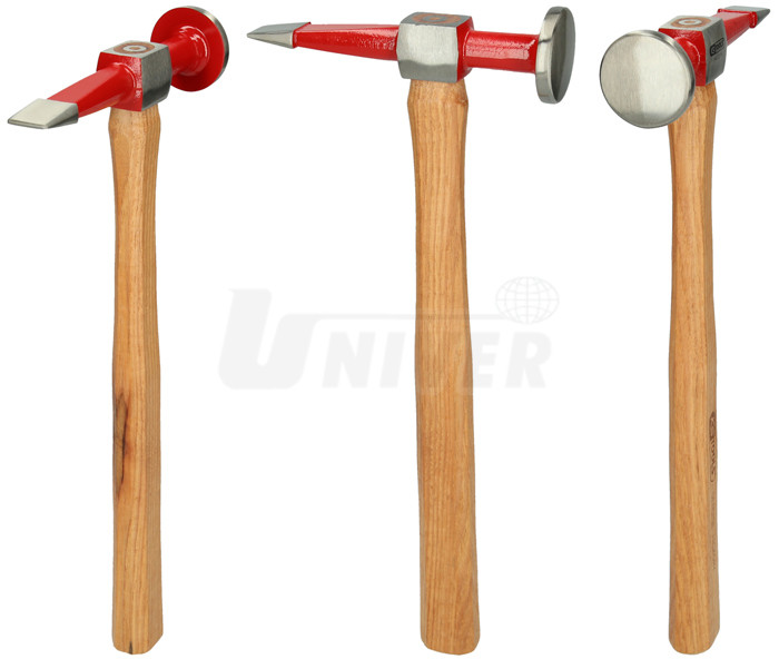 Karosářské vyklepávací kladivo délky 325 mm a hmotnosti 460 g s rovnou plochou špičatou stranou hlavy a kulatou stranou hlavy.- vyklepávací karosářské kladivo s rovnou plochou špičatou a kulatou hlavou
