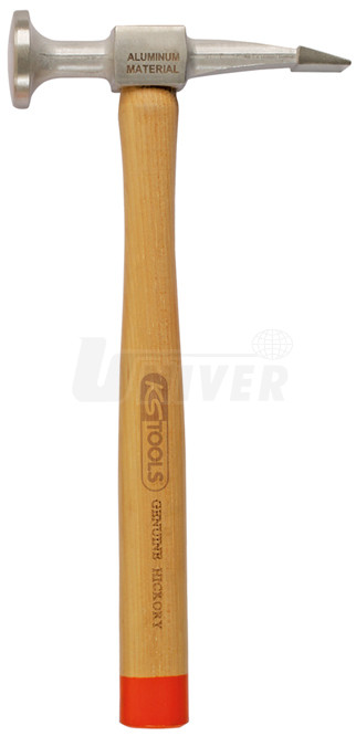 Hliníkové karosářské vyklepávací kladivo délky 300 mm a hmotnosti 140 g se zahnutou plochou špičatou stranou hlavy a kulatou stranou hlavy.- hliníkové vyklepávací karosářské kladivo se zahnutou plochou špičatou a kulatou hlavou zejména pro opravy hliníkových karosérií