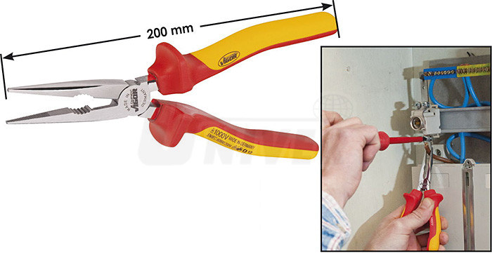 Kleště s půlkulatými čelistmi z vysoce kvalitní speciální oceli. Mají dvou-komponentní ergonomické rukojeti, což umožňuje vysoký přenos síly na čelisti. Samozřejmostí je perfektně vyrobený kloub s velmi úzkou tolerancí rozměru otvoru pro čep. Povrch kleští - leštěný chrom. Délka 200 mm. Kleště jsou zkoušeny při napětí 10 000 V. Umožňují bezpečnou práci až do napětí 1000 V (EN/IEC 60900:2004).Objednávka zboží