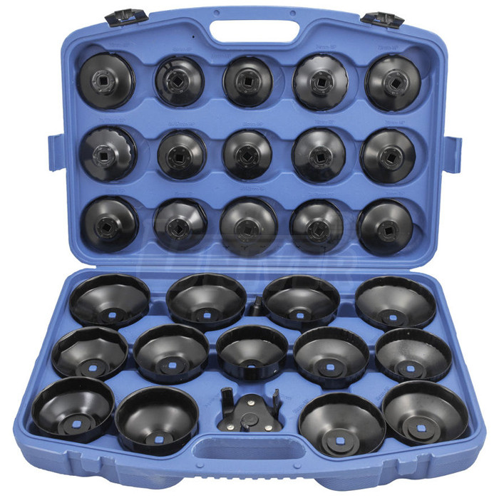 Velká sada miskovitých klíčů na olejové filtry obsahuje 30 kusů nejrozšířenějších rozměrů.- používají se v kombinaci s klíčem/ráčnou se čtyřhranem 3/8" nebo 1/2", protože součástí sady je i adaptér 1/2" (F) a 3/8" (M)