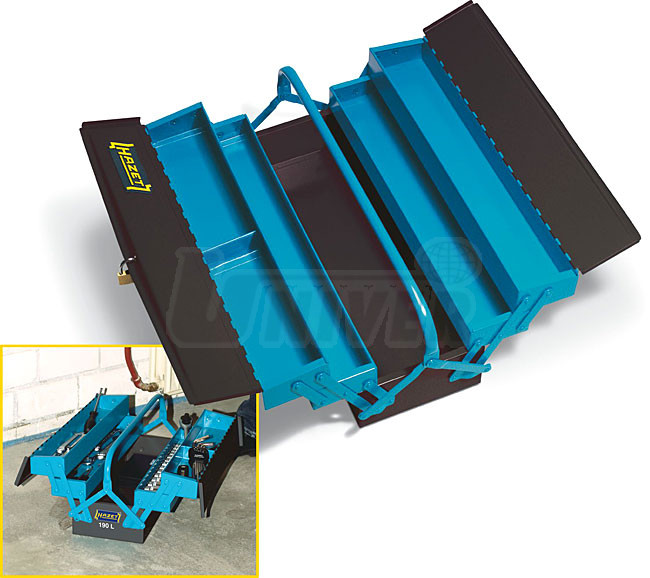 Pětidílná rozkládací skříňka na nářadí (tzv. basa) s držadlem HAZET 190 L vysoké kvality (vyrobeno v Německu) je uzamykatelná. Stabilní provedení s vypalovacím lakem v modro-černém designu. Rozměry: 200 x 530 x 200 mm.