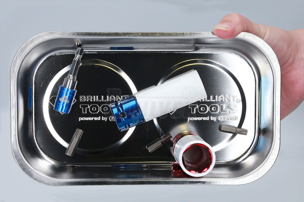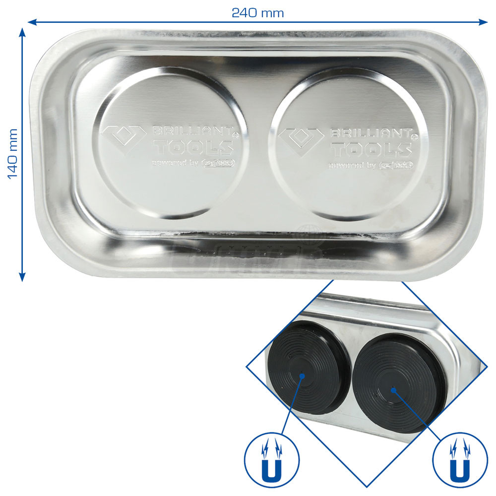 Praktická magnetická miska rozměru 240 x 140 mm z nerezové oceli je ve spodní části opatřena silnými magnety s plastovým krytem.