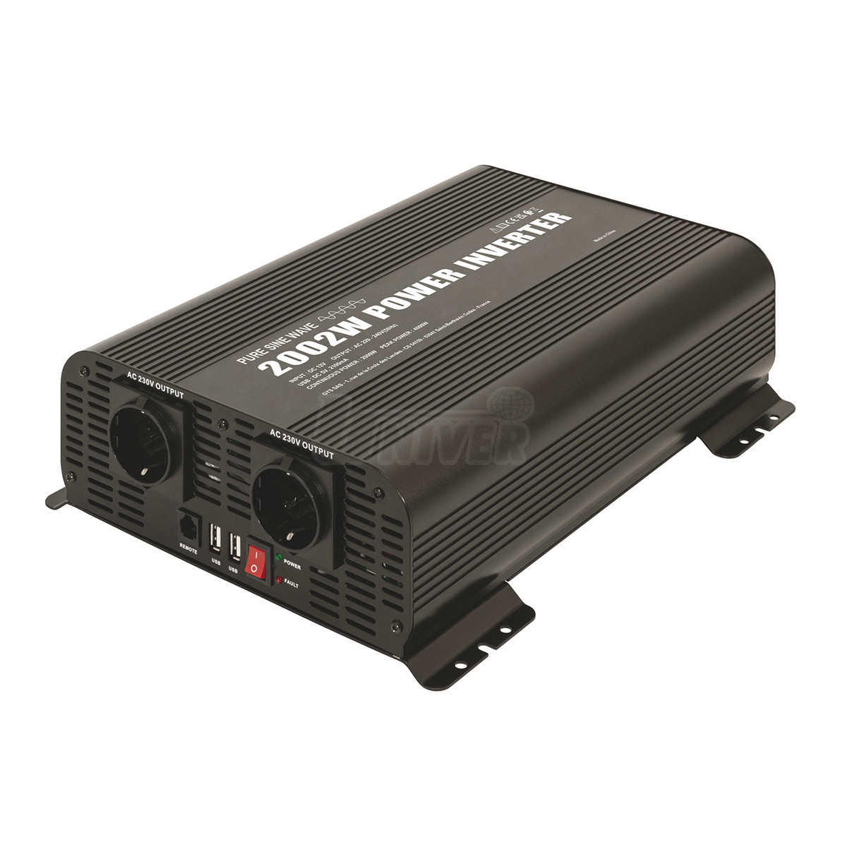 12 V DC 230 V AC 2000 W 4000 W 5 V / 2 A DC 90 % 385 x 250 x 100 mm 5,75 kg |
