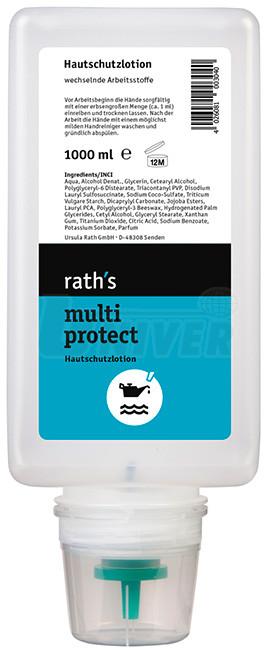 Rath´s multi protect se nanáší v množství 0,5-1 ml (cca čtvrtina až polovina velikosti lískového ořechu) na zadní stranu jedné, čisté a suché ruky. Pak se zadními stranami obou rukou rovnoměrně rozetře. Následně se gel pečlivě vetře do citlivých oblastí ruky (mezi prsty, záhyby prstů, oblast nehtů). Zbývající gel se potom pohyby jako při mytí vmasíruje do pokožky, až je zcela vetřený. Nechá zcela uschnout. Podle zatížení nečistotou a druhu činnosti se může nanesení ochranného mléka Rath´s multi protect opakovat i několikrát za den.