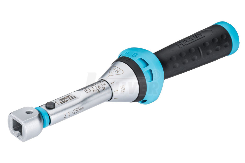 - snadné otáčení mnohostranným nástrčným nářadím HAZET 9 x 12 (např. jako plochý nebo očkový klíč, čtyřhranné nebo bitové přepínací ráčny) umožňuje utažení šroubů s pravotočivým nebo levotočivým závitem s přesným utahovacím momentem a tolerancí +/- 3 %
