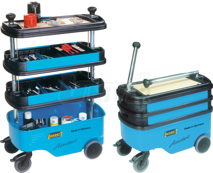 Pojízdný montážní vozík má 3 výsuvné police (obě spodní lze výškově libovolně nastavit), úložný prostor ve spodní části, 4 větší kolečka s tvrzenou pryží (2 říditelná s brzdou), umožňují snadné přejíždění nerovností, kvalitní ocelový plech, vypalovaný lak a centrální zamykání. Kolem výsuvných polic jsou ochranné gumové profily. Obě postranní vodicí tyče lze po složení polic sklopit, čímž se výška celého vozíku sníží až na 647 mm. To je výhodné při převážení vozíku, protože zabere méně místa.