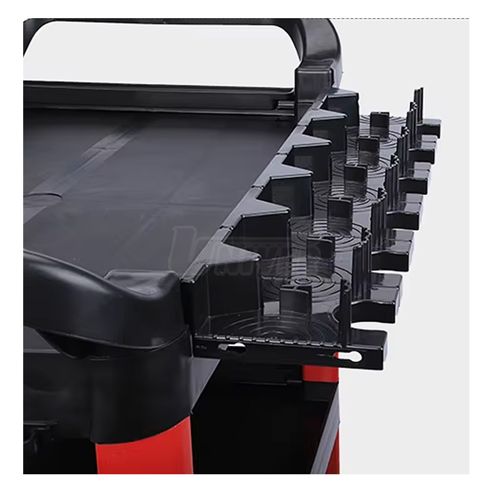 Montážní dílenský vozík vybavený účelným příslušenstvím.- tříúrovňové provedení (spodní, středová a horní úložná deska)