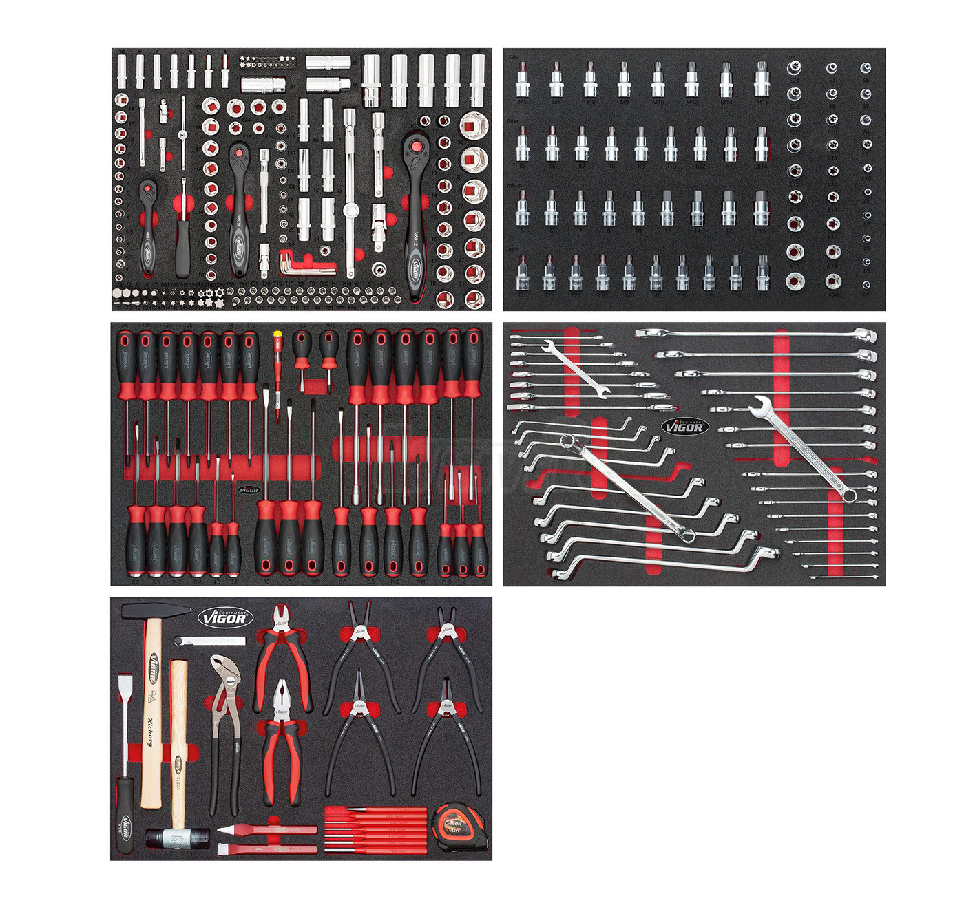 Montážní vozík se 344-dílnou sadou ručního nářadí rozdělenou do 5 velkých modulů má 7 zásuvek (2 vysoké a 5 nízkých).- 5 modulů (VIGOR V4188 / V6643 / V2837 /V4230 / V5637) s ručním nářadím (344 ks), jde o sady ráčen, nástrčných klíčů a bitů 1/4", 3/8" a 1/2" / 4 až 32 mm, otevřených, očkoplochých a vyhnutých očkových klíčů (6 až 27 mm), šroubováků, kleští, sekáčů, vyrážečů, ale také o kladivo, paličku atd.
