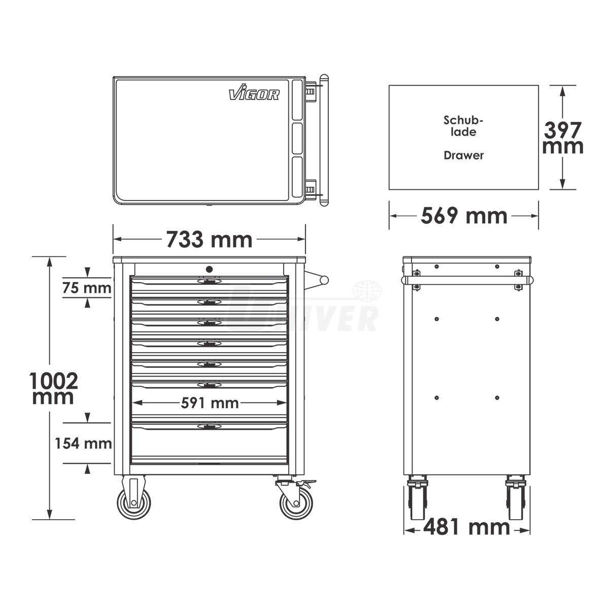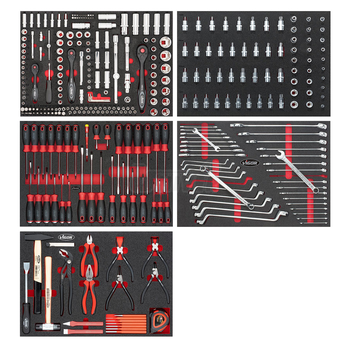 Montážní vozík s nerezovou pracovní deskou se 344-dílnou sadou ručního nářadí rozdělenou do 5 velkých modulů má 8 zásuvek (1 vysoká a 7 nízkých).- 5 modulů (VIGOR V4188 / V6643N / V4230 / V5637N / V2837) s ručním nářadím (344 ks):