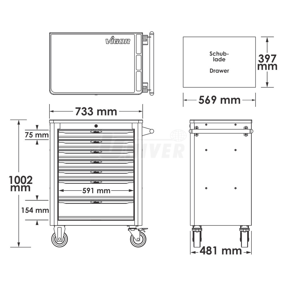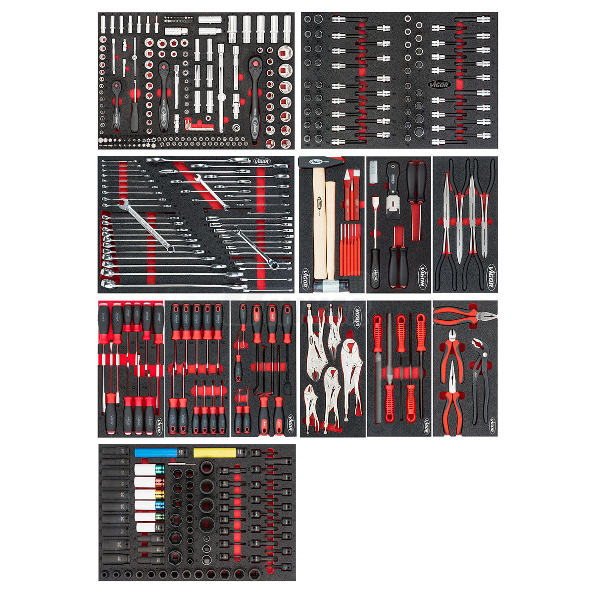 Montážní vozík s nerezovou pracovní deskou se 442-dílnou sadou ručního nářadí rozdělenou do 4 velkých a 9 menších modulů má 8 zásuvek (1 vysoká a 7 nízkých).- 13 modulů (VIGOR V4188 / V4753 / V6724N / V5006 / V5017 / V4995 / V5068 / V4991 / V5070 / V5004 / V5072 / V5633N / V6811) s ručním nářadím (442 ks):