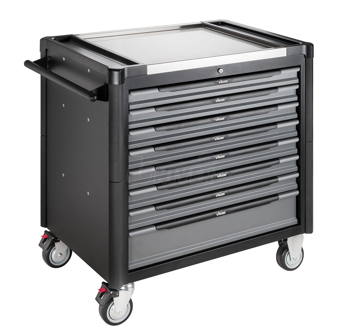 Extra hluboký montážní vozík s 469-dílnou sadou ručního nářadí rozdělenou do 8 modulů má 8 zásuvek (1 vysokou a 7 nízkých) a nerezovou pracovní desku.- 8 modulů (VIGOR V6821 / V6822 / V6807 / V 6808 / V6813 / V6814 / V6815 / V6816) s ručním nářadím (469 ks), jde o sady ráčen, nástrčných klíčů a bitů 1/4", 3/8" a 1/2" / 4 až 32 mm, otevřených, očkoplochých a vyhnutých očkových klíčů (6 až 36 mm), šroubováků, kleští, sekáčů, vyrážečů, ale také o kladivo, ocelovou palici atd.