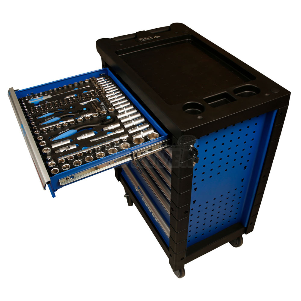 Dílenský montážní vozík s ručním nářadím, se 7 zásuvkami uloženými v kuličkových ložiskách a s robustní skříní s centrálním zamykáním.- masivní, mechanicky odolná, celokovová skříň i pro náročné provozní nasazení
