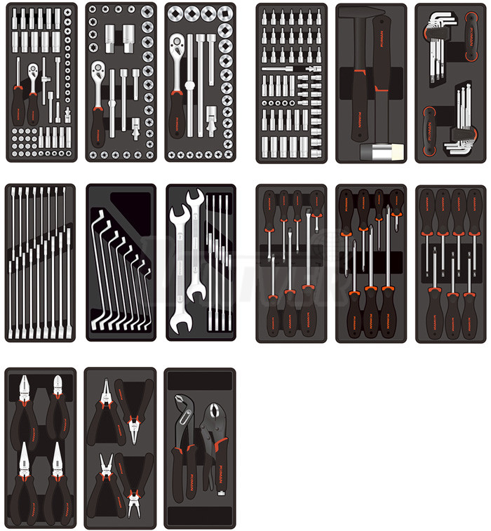Exkluzivní typ kvalitního montážního vozíku má 7 zásuvek (5 nižších, 1 střední a 1 vysoká) uložených v teleskopických kolejnicích s kuličkovými ložisky, bezpečnostní uzamykací systém (2x klíč), aluminiová držadla zásuvek s popiskovými lištami a s automatickou západkou proti samovolnému otevření zásuvky, měkké obložení držadel integrovaných do horní plastové pracovní desky se zvýšenými okraji a s vyztuženou částí pro případnou instalaci svěráku, speciální plastové ochrany všech 4 rohů proti poškození při nárazu a 4 kolečka Ø 125 mm (2 pevná, 2 otočná s poziční brzdou) pro vysoké namáhání (kategorie Heavy Duty).V 5 vrchních zásuvkách jsou umístěny moduly s profesionálním nářadím vysoké kvality (chrom-vanadium a speciální ocel) a 2 spodní zásuvky jsou prázdné.