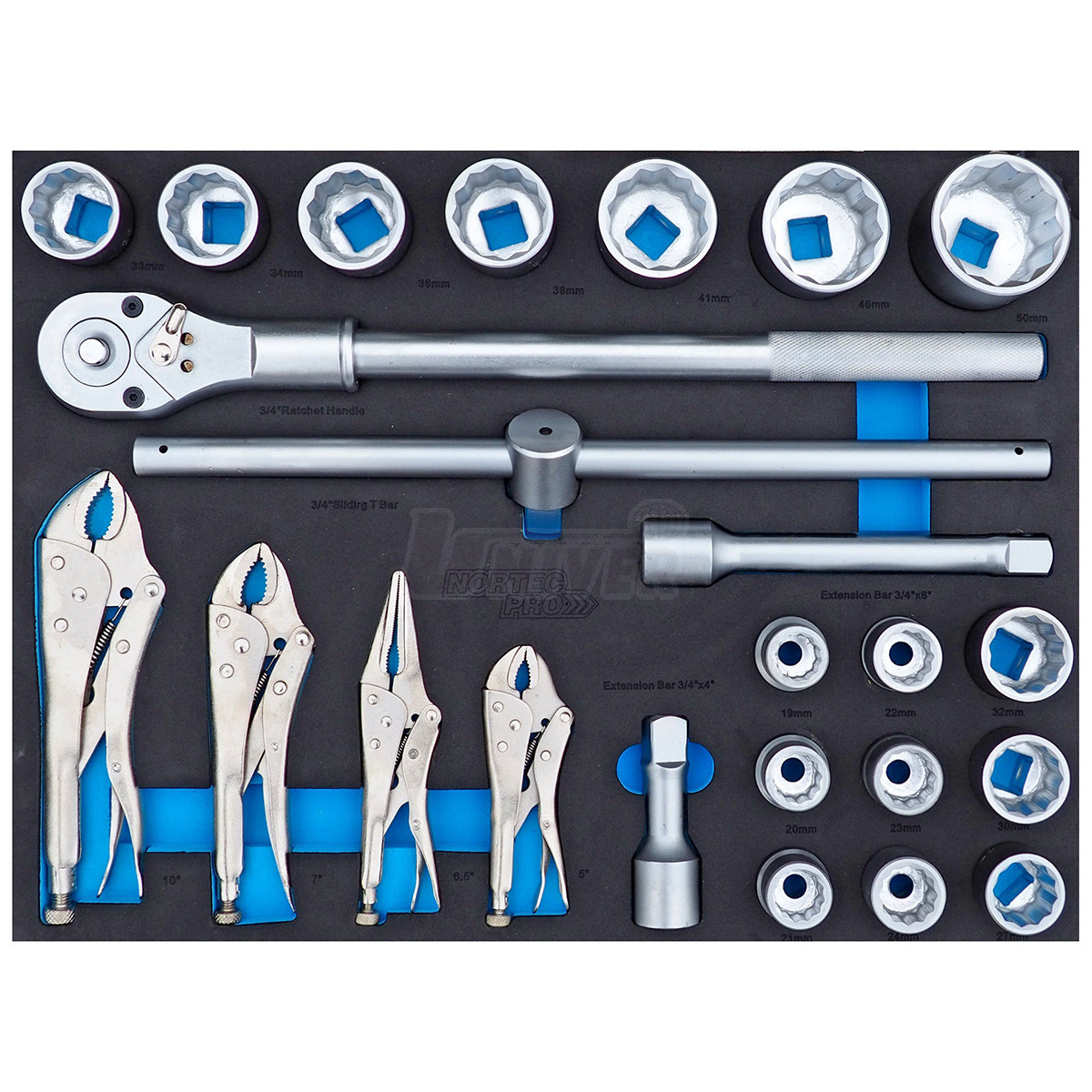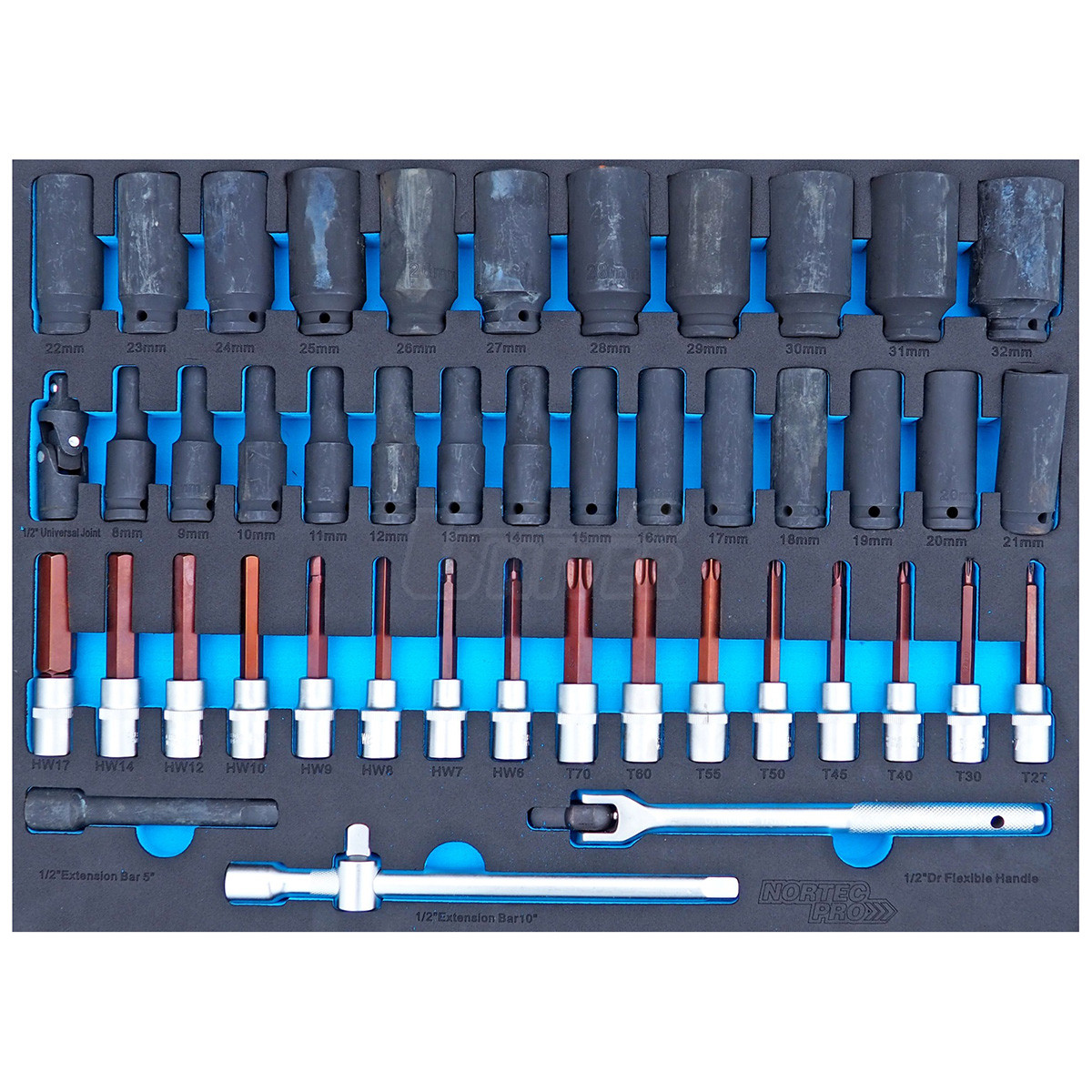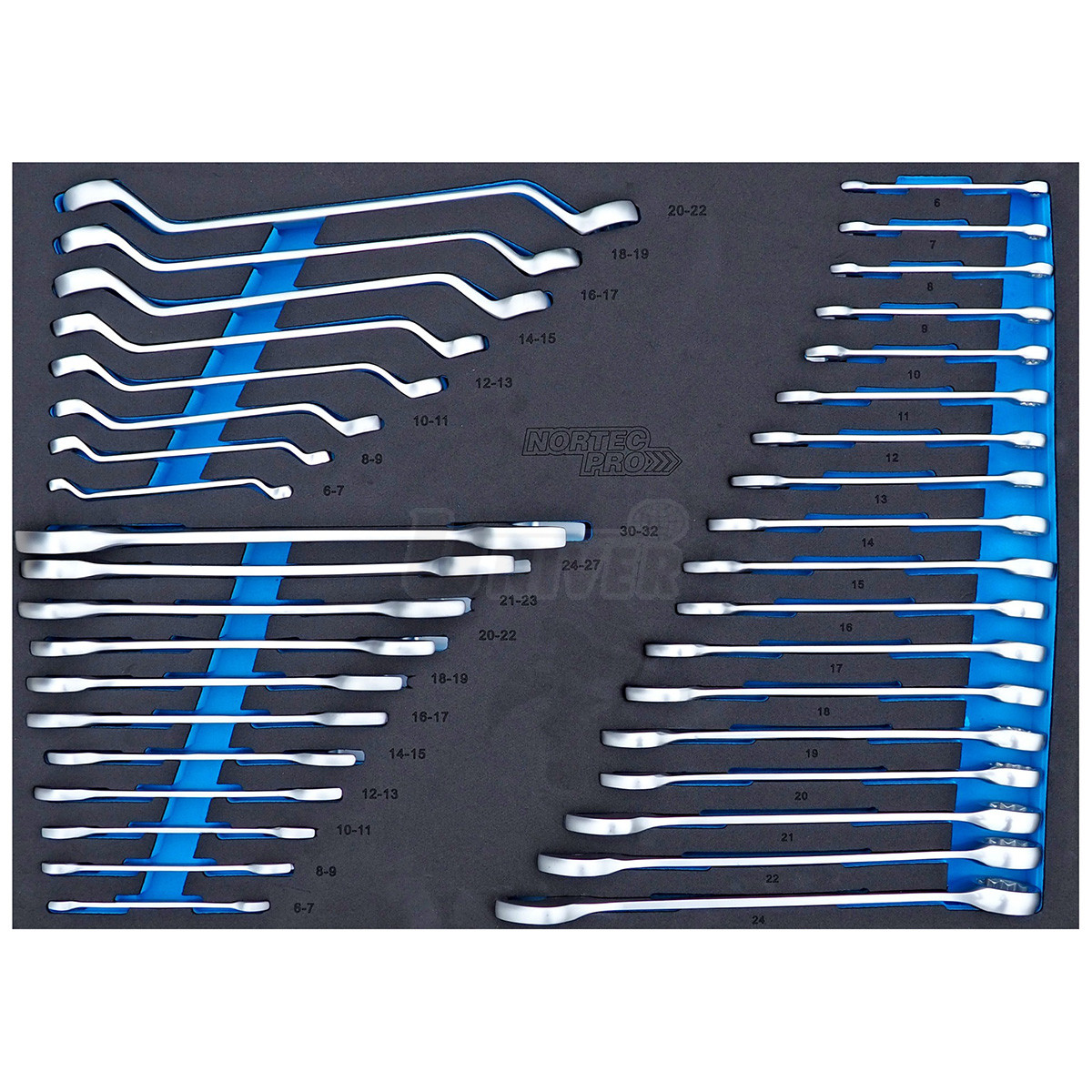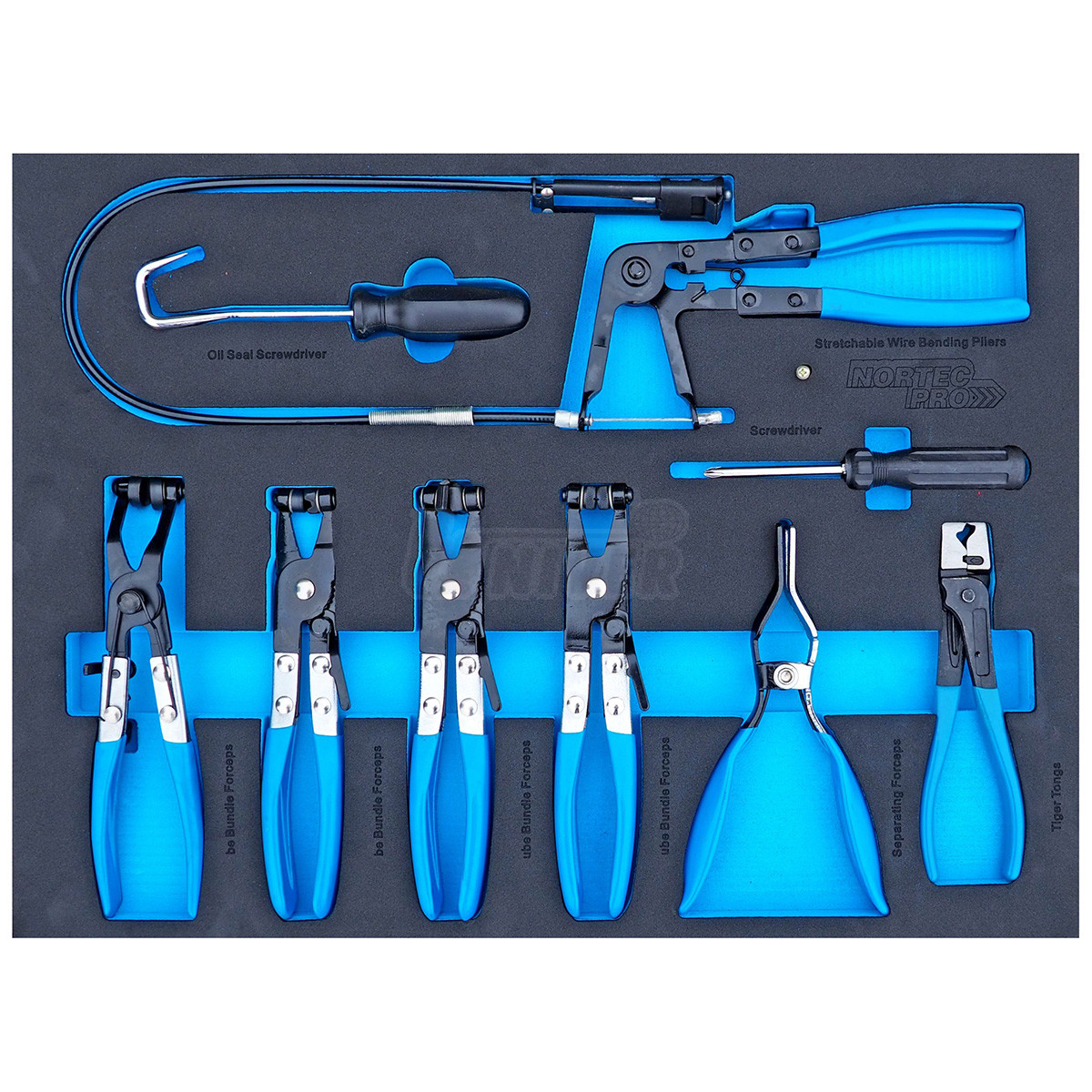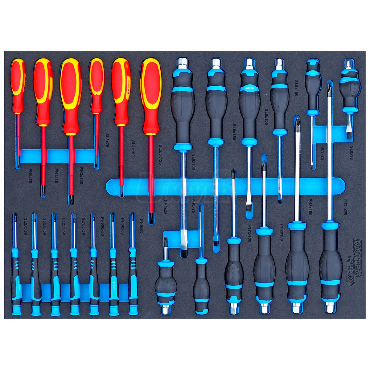 - 5 zásuvek vybavených ručním nářadím (ploché otevřené, očkoploché a zahnuté očkové klíče / ráčna, nástavce, nástrčné hlavice, skřipcové kleště / šroubováky s úderovou hlavicí, izolované šroubováky / nástavce a bity / speciální kleště)