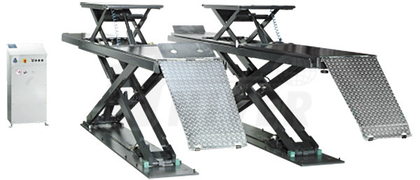 Nůžkový elektrohydraulický plošinový zvedák (3,5 t) s plošinami (4560 mm), s přídavným nůžkovým zvedákem a sadou příslušenství pro měření geometrie kol.- instalace na podlahu nebo s použitím přejezdových klapek i do úrovně podlahy