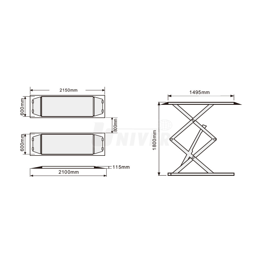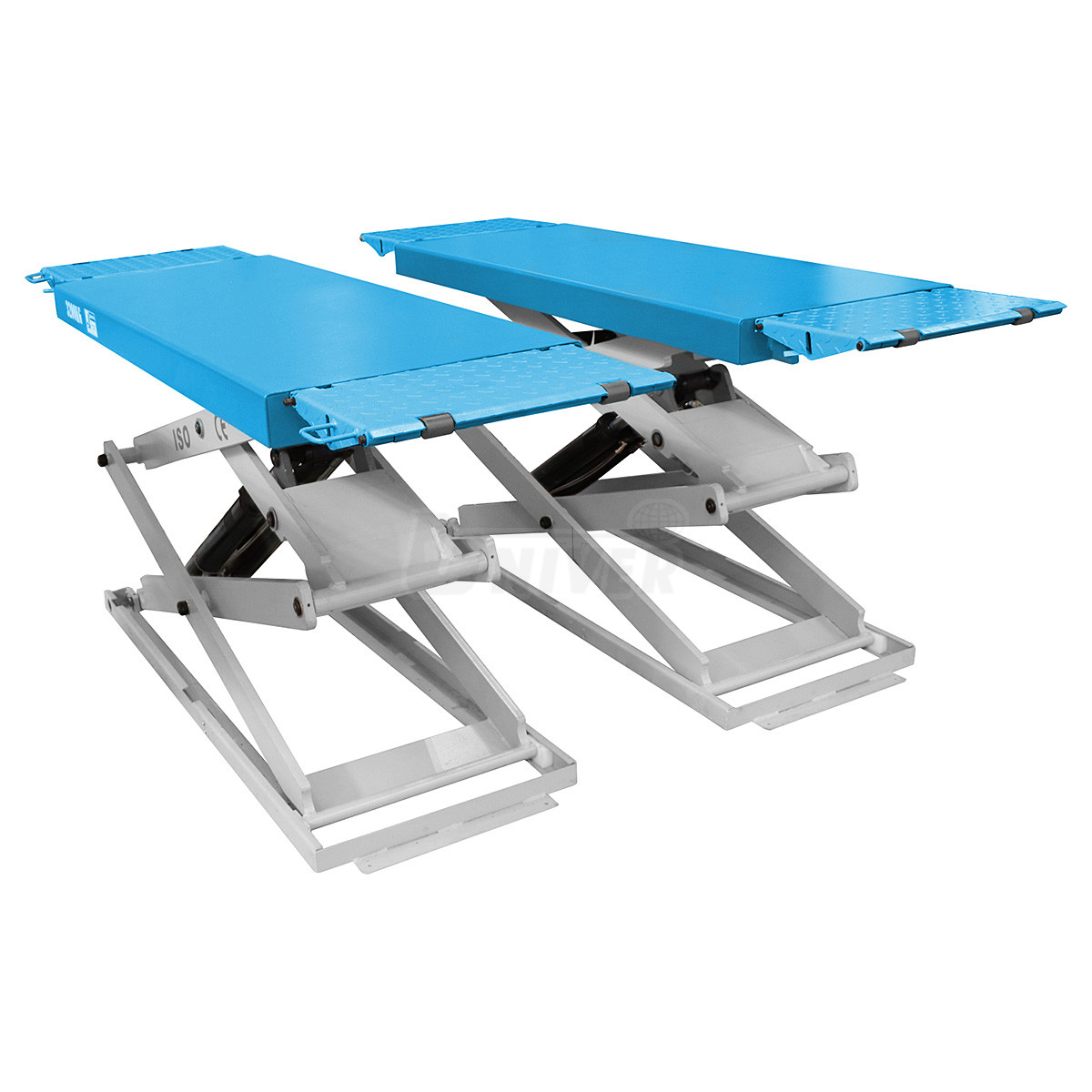 - dva spodní rámy, tzv. (dvou)nůžková zvedací konstrukce se 2 hydraulickými jednotkami / válci, dvě nosné plošiny a oddělená ovládací skříň