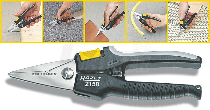 Nůžky pro přesné stříhání tenkých plechů, drátů, umělých hmot, samolepicích vyvažovacích tělísek, koberců, čalounění atd. Ergonomické tvarování umožňuje zablokování a uvolnění otevření kleští jednou rukou. Čelisti mají kruhové osazení pro odizolování vodičů (1,0-1,5 mm2).