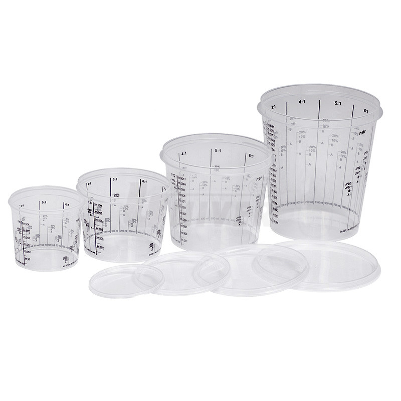 Transparentní plastové odměrné kelímky s tištěnými stupnicemi / měřítky o objemu 0,385 l / 0,750 l / 1,4 l / 2,3 l na míchání barev.- materiál: odolný proti barvám, rozpouštědlům apod.