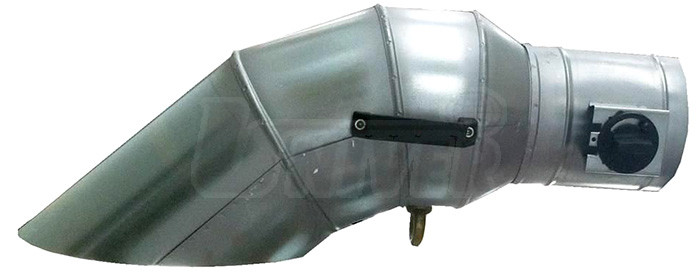 Ocelové trychtýře pro odsávání výfukových plynů mají vyústění na výfuk Ø 200 mm se šikmým profilem 45°, tvar oblouku 60°, uzavírací klapku a příruby pro odsávací hadici Ø 150 / 200 mm.