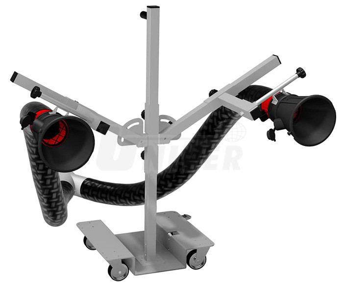Trychtýře pro odsávání výfukových plynů mají vyústění na výfuk Ø 160 mm, 2 hadice Ø 75 a Ø 100 mm, Y-kus a pojízdný nastavitelný stativ.