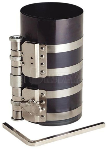 Pásový přípravek na stlačení pístních kroužků při montáži pístů do válců.- pásový přípravek na stlačení pístních kroužků ze speciální pružinové oceli