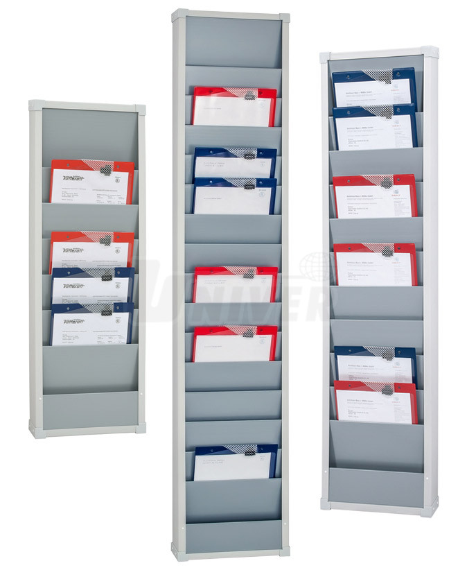 Plánovací tabule pro dokumenty formátu A4 s jednotnou šířkou 315 mm, ve 3 výškách a s počtem přihrádek 6, 10 nebo 15.- 3 různě velké plánovací tabule ze speciální umělé hmoty pro dokumenty formátu A4 (desky na zakázky, zástrčné karty atd.)