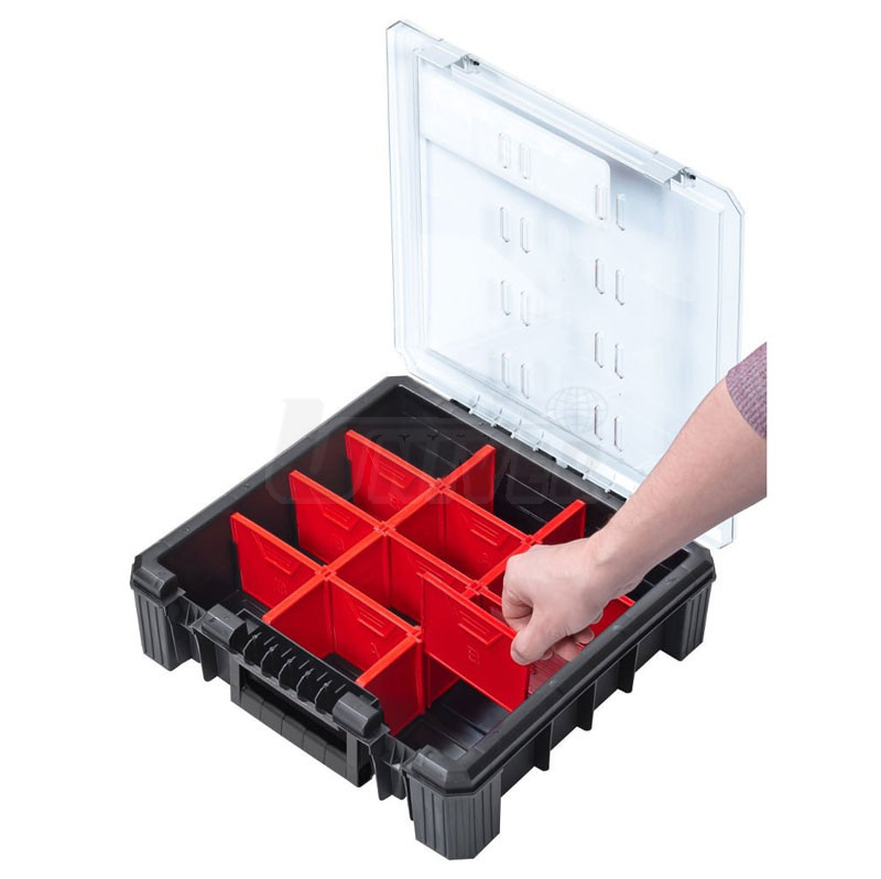 Profesionální plastový organizér se zvýšenou odolností s 12 přestavitelnými přihrádkami s průhledným víkem a s integrovaným držadlem.- profesionální organizér s přestavitelnými plastovými přepážkami