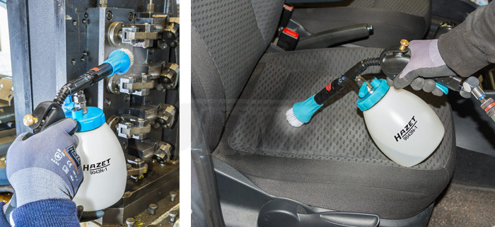 Rotační pneumatická čisticí pistole se zásobníkem čisticího prostředku 1 l.- praktická a účinná rotační čisticí pistole se osvědčila např. při čištění čalounění, koberců apod. s použitím vhodného čisticího prostředku v zásobníku o objemu 1 l