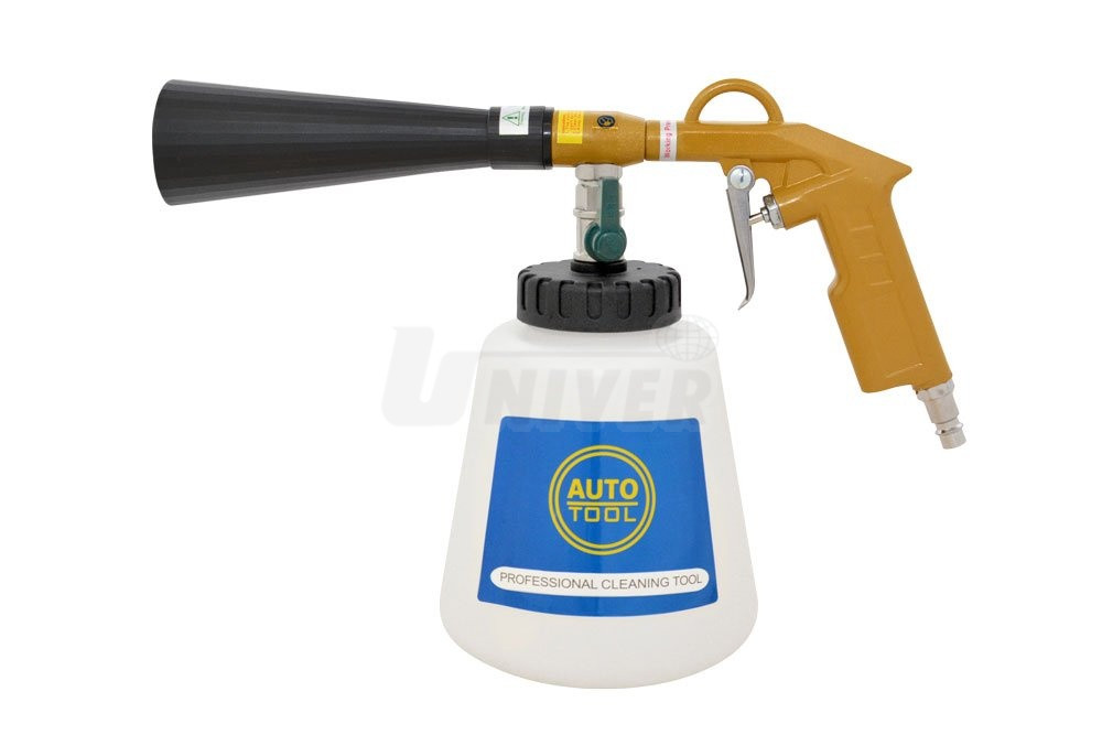 Pneumatická čisticí pistole se spodní nádržkou na čisticí prostředek představuje.- do tenké speciální kovové trubičky uložené v kuličkovém ložisku v hubici čisticí pistole je přiváděný stlačený vzduch, který způsobuje extrémně rychlou spirálovou rotaci trubičky v hubici, ze které pak vychází velmi jemně rozprášená mlhovina čisticího prostředku se vzduchem pod vysokým tlakem a s vířivým pohybem (efekt tornáda), kdy částečky nečistoty jsou vytrhávány z čištěného povrchu velkou silou