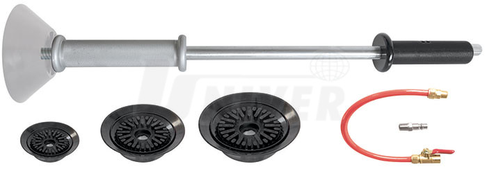 Pneumatické kluzné vytahovací kladivo s přísavkami nalézá uplatnění při karosářských rovnacích pracích.Základem sady je pneumatické kluzné vytahovací kladivo o hmotnosti 2,5 kg a 3 přísavky ze speciální gumy (průměr 60, 120 a 150 mm). Přísavka zajistí prostřednictvím stlačeného vzduchu 6-8 bar požadované kvalitní přilnutí ke karosérii bez jejího poškození a úderovým kladivem se vytahuje deformovaná plocha karosérie. Součástí sady je i připojovací hadička na stlačený vzduch s uzavíracím ventilem a s rychlospojkou.
