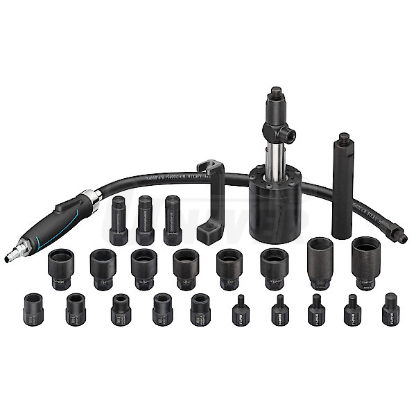 Pneumatický rázový vytahovák umožňuje šetrné vymontování pevně usazených vstřikovačů dieselových motorů bez vynaložení síly.- praktická sada s pneumatickým vytahovákem vstřikovačů dieselových motorů, s univerzální upínací čelistí a řadou adaptérů