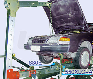 Když se provádí rovnání směrem nahoru nebo dolů, nastavitelný nosník 680E lze použít jako podpěru i pro aktuální rovnání. Jak je vidět z připojených obrázků, šroub A nosníku umožňuje tlak/tah přibližně 4 t, který je většinou dostatečný pro srovnání přední nebo zadní části karosérie.