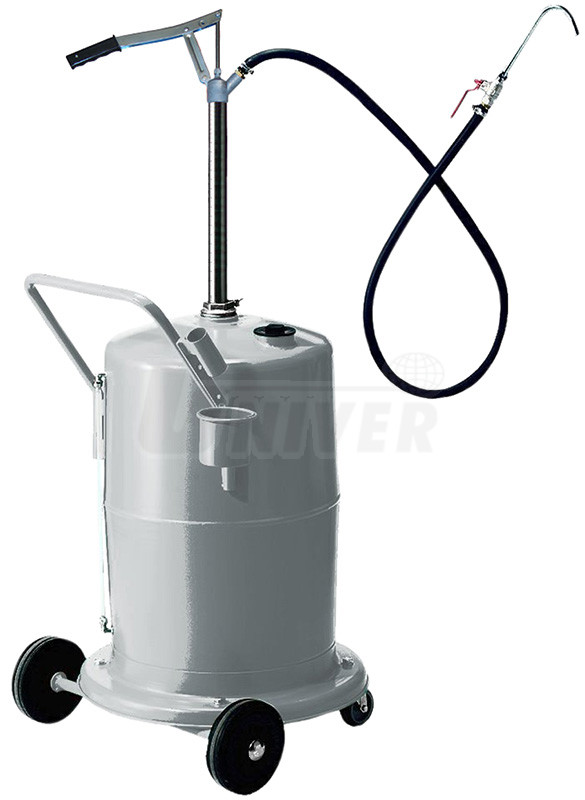 Pojízdná plnička motorových, převodových a obdobných olejů s ručním pákovým čerpadlem a zásobníkem o objemu 75 l.Má