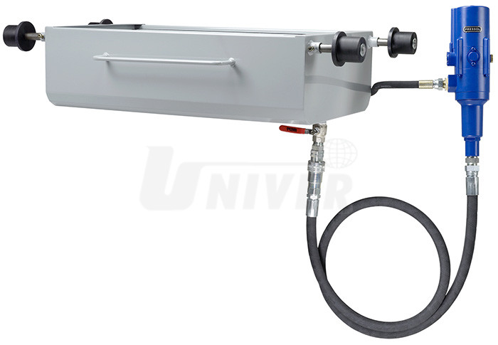 Pojízdná sběrná vana z ocelového plechu s pneumatickým čerpadlem 5:1 na vyjetý olej pro použití v pracovních/montážních jámách.Má