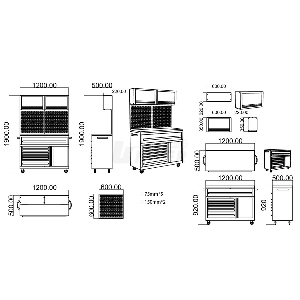 - spodní skříňka je dělená na levou část se 7 lehce výsuvnými zásuvkami s nosností každá 40 kg pro ruční nářadí (5 zásuvek nižších 75 mm, 2 zásuvky vyšší 150 mm) a na pravou část s dvířky